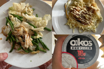 シーズニング?パウダーを使った炒め物と、初のライスペーパーを使ったお好み焼き。