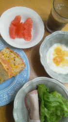 朝食 コーンのパン・ハム・レタス・ヨーグルト(リンゴの甘煮のせ)・グレープフルーツ