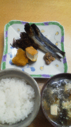 朝食 うるめ・イカナゴくぎ煮・奈良漬け・カボチャ・ご飯・味噌汁・野菜ジュース